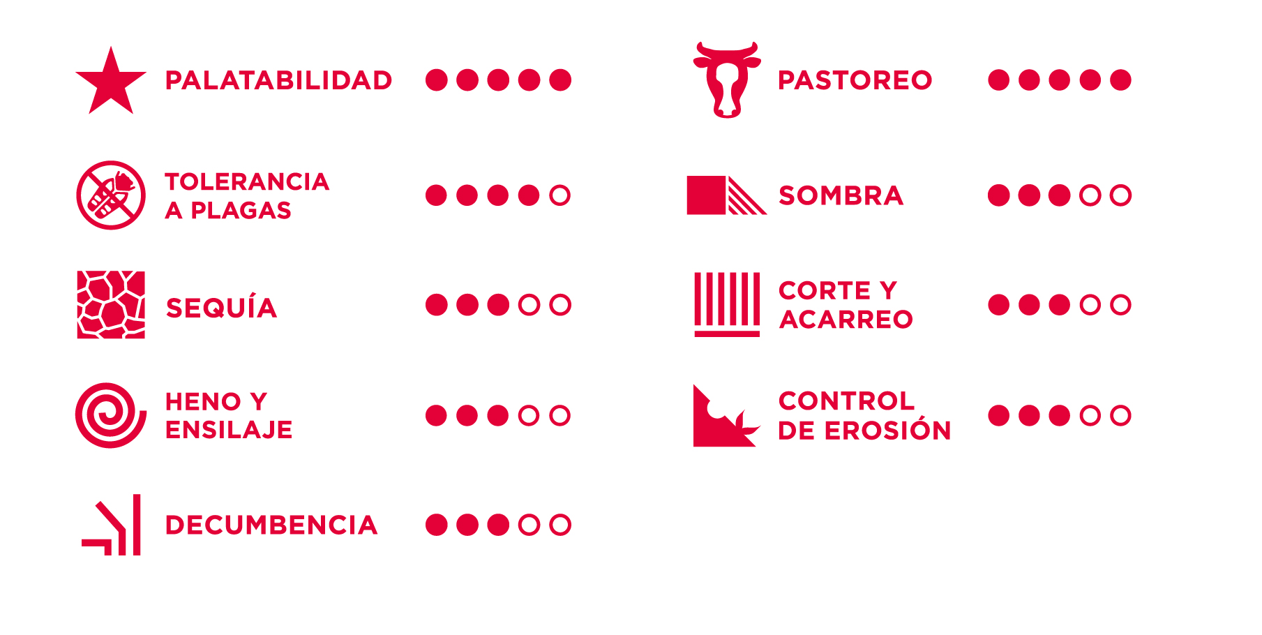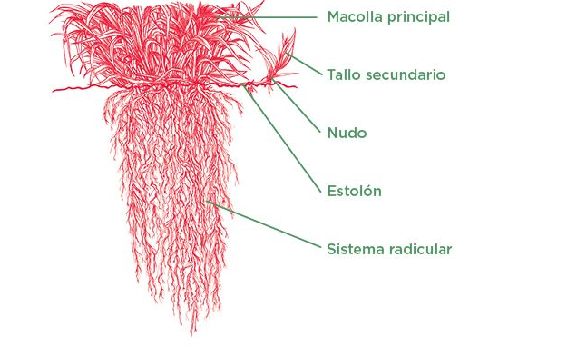 It is recommended that the first grazing (90 to 110 days after germination) be carried out with small animals (calves) to stimulate the development of new tillers and obtain stronger plants. Subsequently, rotational grazing should be implemented, with a maximum grazing period of 3 days and a rest period of 25 to 35 days, depending on the time of year.
